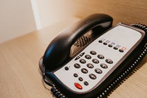 Hotel room phone on a wood desk – Image