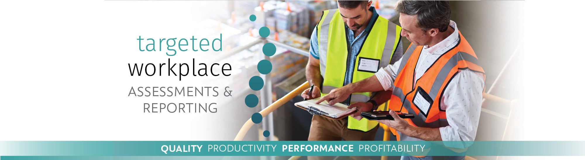 Two men, a QP3 Engineer going over an assessment check with a client. Industrial environment, yellow safety vests.